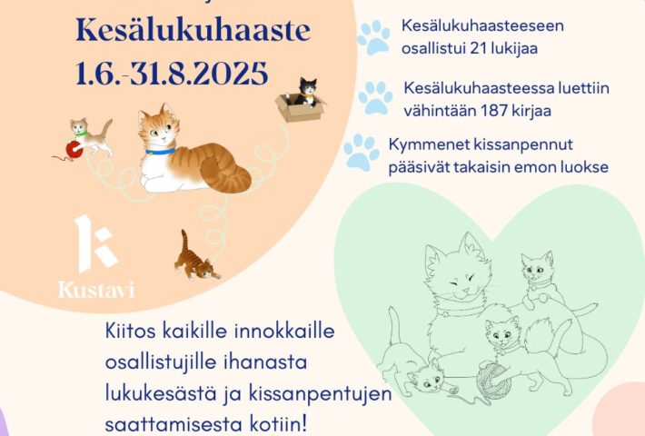 Suuri kiitos siis kaikille innokkaille osallistujille ja kirjastossa ahkerasti vierailleille perheille ihanasta lukukesästä, osallistumisesta kesälukuhaasteeseen ja kissanpentujen saattamisesta kotiin! Kustavin kirjasto saa olla teistä ylpeä ja iloinen.