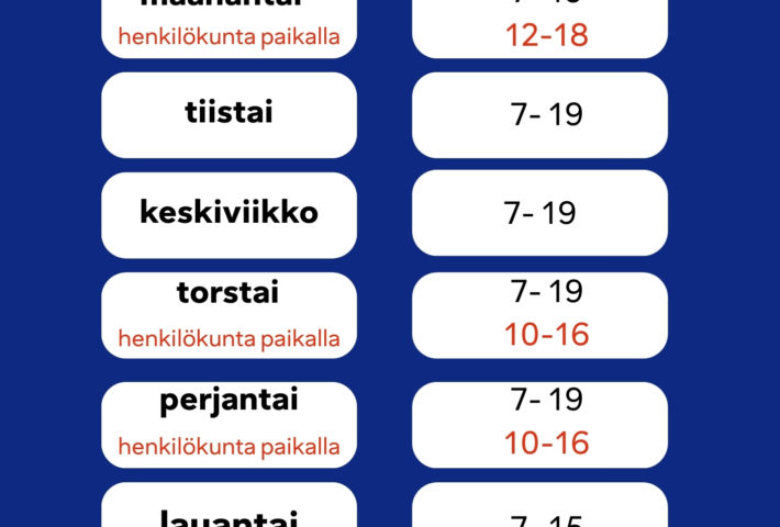 maanantai omatoimi klo 7-12 ja klo 18-19 sekä palveluaika klo 12-18