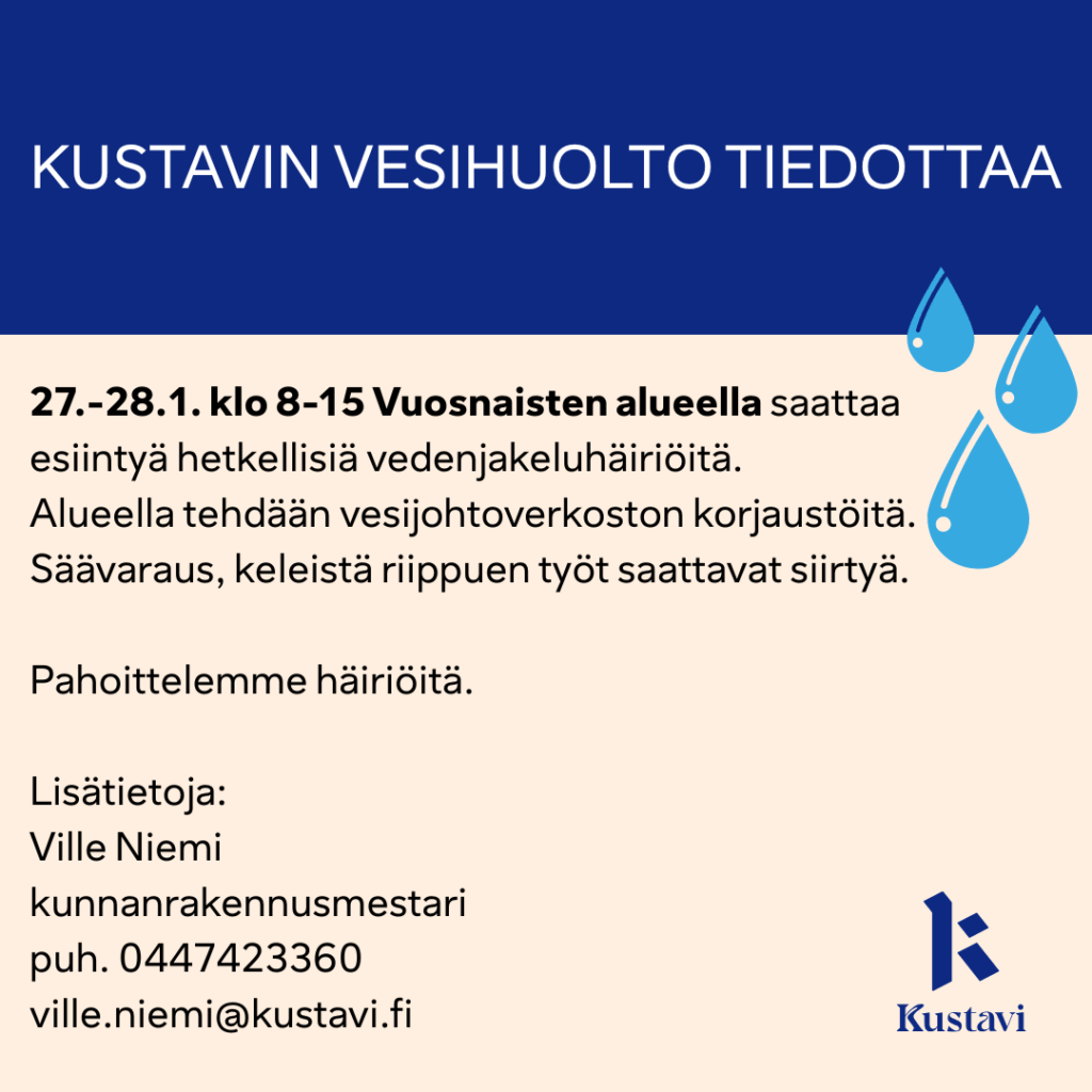 • Vedenjakeluhäiriöitä Vuosnaisten alueella 27.-28.1.2026 21.1.2026