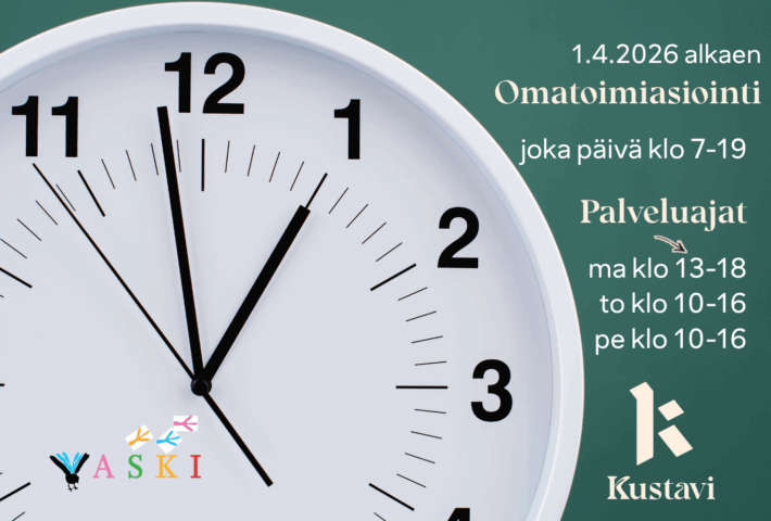 Maanantaisin asiakaspalvelua saa huhtikuusta eteenpäin tuntia myöhemmin eli jatkossa maanantaina palveluaika on klo 13-18. Torstain ja perjantain palveluaika pysyy samana klo 10-16.