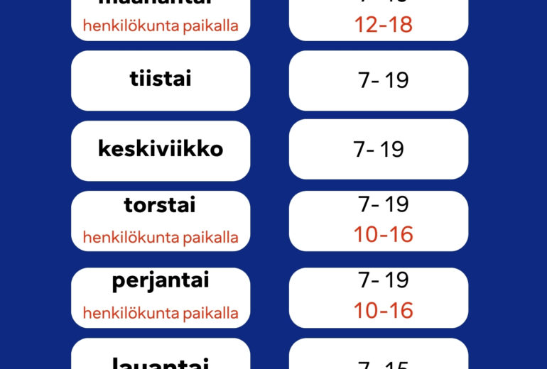 22.12.2025-1.1.2026 kirjasto on käytössä omatoimisesti kirjastokortilla ja tunnusluvulla eikä henkilökuntaa ole paikalla. Myös kunnantalo on suljettu 22.12.2025-5.1.2026 eikä henkilökunta ole tuolloin tavoitettavissa. Kiireellisissä kiinteistönhuoltoasioissa soita päivystävälle kiinteistönhoitajalle numeroon 044 383 8822. Jos tarvitset kunnantalon tai kirjaston henkilökunnan apua ja asiakaspalvelua, hoidathan asiasi …