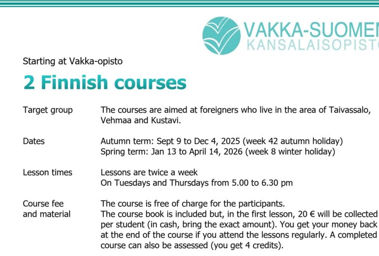 Aloita suomen kielen opiskelu Vakka-Opistossa. Syyskuussa alkaa kaksi suomen kurssia: Suomen alkeet 1 ja Suomen alkeet 2. Kohderyhmä Kurssit on suunnattu Taivassalossa, Vehmaalla ja Kustavissa asuville maahanmuuttajille. Aika syksy 9.9.-4.12.2025 (syysloma vko 42) kevät 13.1.-14.4.2026 (talviloma vko 8) Oppitunnit kaksi kertaa viikossa …
