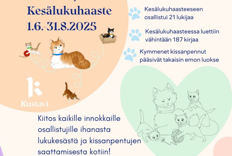 Kustavin kirjaston kesälukuhaasteessa 1.6.-31.8.2025 väritettiin tassunjälkiä aina luetun kirjan jälkeen ja autettiin samalla suloisia kissanpentuja löytämään reitti emon hoiviin. Kesälukuhaasteeseen osallistui innokasta 21 lukijaa, jotka lukivat vähintään 187 kirjaa eli jopa kymmenet kissanpennut pääsivät takaisin emon luokse. Suuri kiitos siis kaikille innokkaille …
