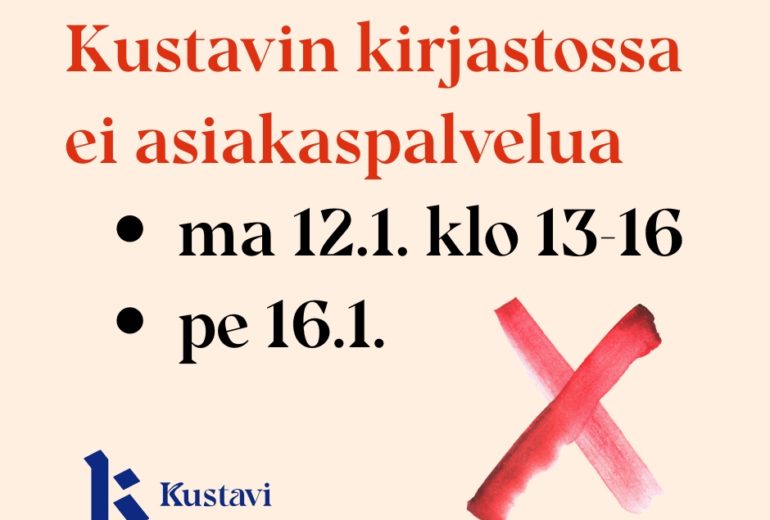 Kustavin kirjastossa ei ole asiakaspalvelua maanantaina 12.1. klo 13-16 koulutuksen ja perjantaina 16.1. työmatkan vuoksi. Jos tarvitset apua tai asiakaspalvelua viikolla 3, suosittelemme asioimaan kirjastossa torstaina 15.1. klo 10-16. …