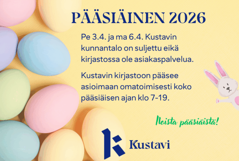 Pääsiäisen aikaan eli perjantaina 3.4. sekä maanantaina 6.4. Kustavin kunnantalo on suljettu eikä kirjastossa ole asiakaspalvelua. Kustavin kirjastoon pääsee kuitenkin asioimaan omatoimisesti kirjastokortilla ja tunnusluvulla koko pääsiäisen ajan joka päivä klo 7-19. Iloista pääsiäistä! …