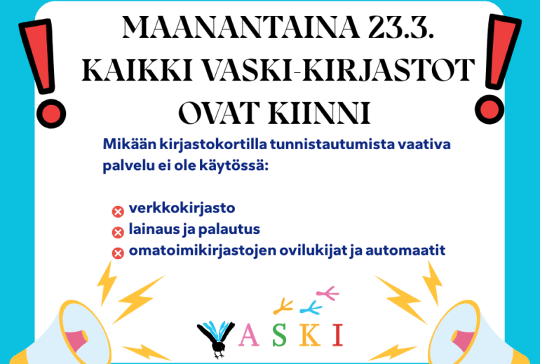 Kaikki Vaski-kirjastot ovat kiinni maanantaina 23.3. ja hieman ennen ja jälkeenkin. Vaski-kirjastoissa tehdään laaja Koha-kirjastojärjestellmän päivitys maaliskuussa. Järjestelmäpäivitys alkaa jo sunnuntaina 22.3. klo 19 ja kestää arviolta tiistaihin 24.3. klo 12 saakka. Tuona aikana kirjaston palvelut eivät ole käytössä. Mikään kirjastokortilla tunnistautumista …