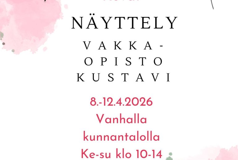 Vakka-Suomen Kansalaisopisto järjestää huhtikuussa Kustavissa vanhalla kunnanvirastolla (Keskustie 7) perinteisen kevänäyttelyn, jossa esitellään kuvataiteen ja kädentaitojen ryhmien kurssien satoa ja taidonnäytteitä. Näyttely on avoinna 8.-12.4. klo 10-14. Tervetuloa! …
