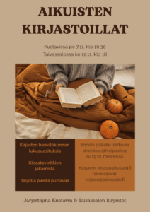 Aikuisten kirjallisuusilta: henkilökunnan ja asiakkaiden kirjavinkkejä ja pientä purtavaa.