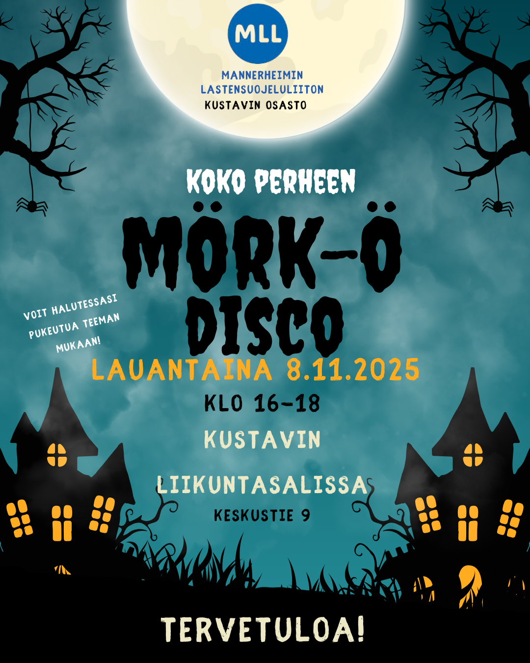 MLL Kustavi järjestää koko perheen MörkÖ-Diskon lauantaina 8.11. klo 16-18 Kustavin Liikuntasalissa (Keskustie 9).