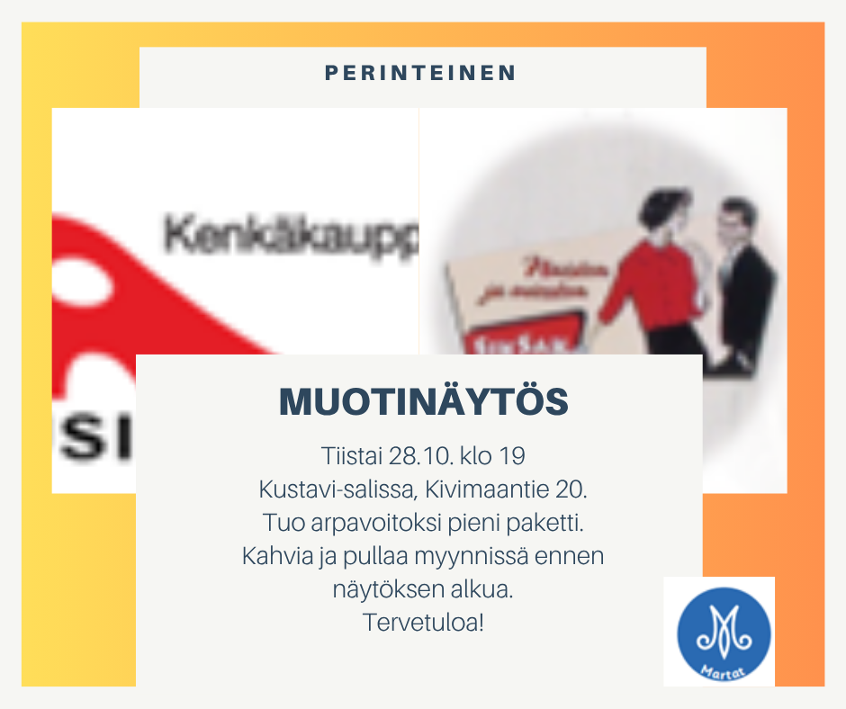 Kustavin Martat järjestävät perinteiseksi käyneen syysmuotinäytöksen, jossa Putiikki SikSak ja Kenkäkauppa Alina Uudestakaupungista esittelevät meillä syksyn ja talven muotia.