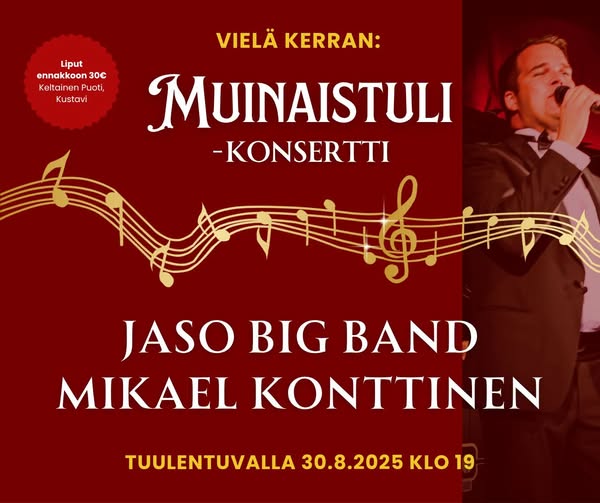 Kustavilaisten ja kesäasukkaiden toive on kuultu – JASO Big Band ja loistava Mikael Konttinen palaavat vielä kerran lavalle Muinaistuli-konsertissa lauantaina 30.8.2025 klo 19 Tuulentuvalla!
